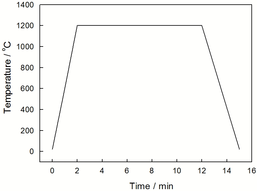 使用MBD8级人造金刚石(粒度为220-245 mm)作为分散相, 用纯度为99.95%(质量分数)的铜块作为金属基体。先将金刚石粉末放入钼金属杯中, 再将铜块放在金刚石粉末上方, 然后盖上另一个钼金属杯。将该装置在550℃、气压小于10-2 Pa的条件下进行真空热处理, 再将其放入六面顶中, 升温至1200℃并在5 GPa条件下保温10 min, 制备出铜/金刚石复合材料。其工艺曲线如图1所示。