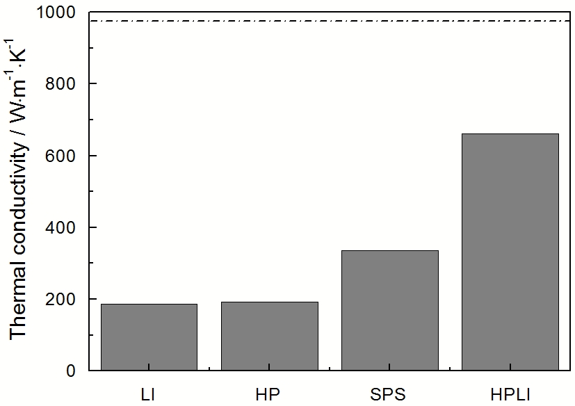 Fig.6 Comparison of thermal conductivity for copper/diamond composites fabricated with different methods. The dotted line represents the value predicted by the H-J model. LI: liquid infiltration, HP: hot pressing, SPS: spark plasma sintering, HPLI: high pressure liquid infiltration