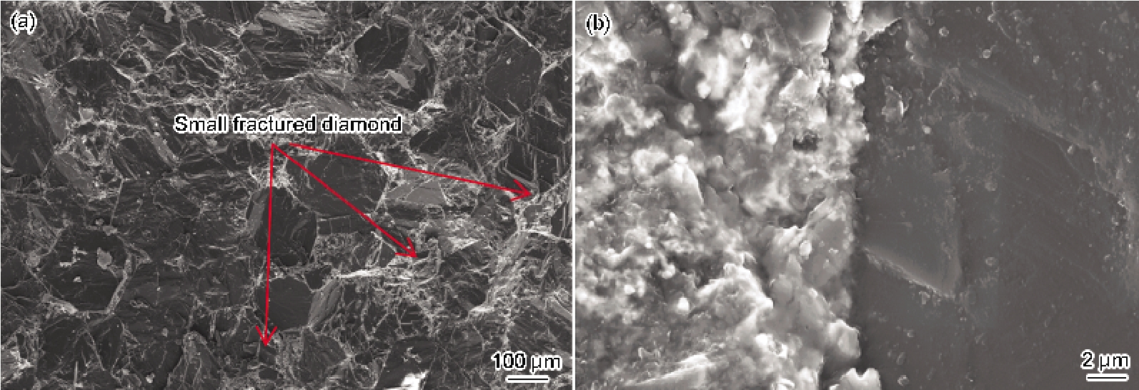 Fig.4 SEM images of fractured surfaces of the copper/diamond composites: (a) low magnification, (b) high magnification