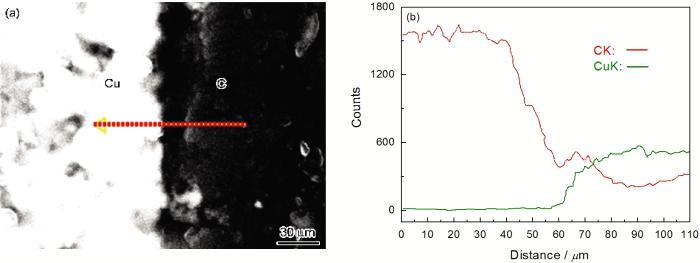 由图4可见, 铜和金刚石的界面处没有发现孔洞或裂纹, 说明金刚石与铜界面结合良好。许多金刚石颗粒呈现断面的形貌特征(图4a), 可从两个方面解释此现象。一方面是样品断裂时的瞬间作用力很大, 金刚石体积分数高达90%且部分金刚石颗粒相互连通, 从而导致金刚石颗粒发生断裂。另一方面, 铜与金刚石的界面结合良好, 而人造金刚石由于含有缺陷而导致强度降低, 因此, 两相界面结合强度有可能高于金刚石强度。另外, 由图4a可以看出, 制备的铜/金刚石复合材料中含有部分碎掉的金刚石。其原因是, 在制备过程中过高的压力导致部分金刚石被压碎。图5表明, 碳元素和铜元素在界面处的分布逐渐变化, 表明界面处存在过渡层。又由图2可知, 铜/金刚石复合材料样品中并没有产生新物质, 说明在金刚石与铜的界面处部分碳和铜呈现互溶状态, 形成冶金结合。