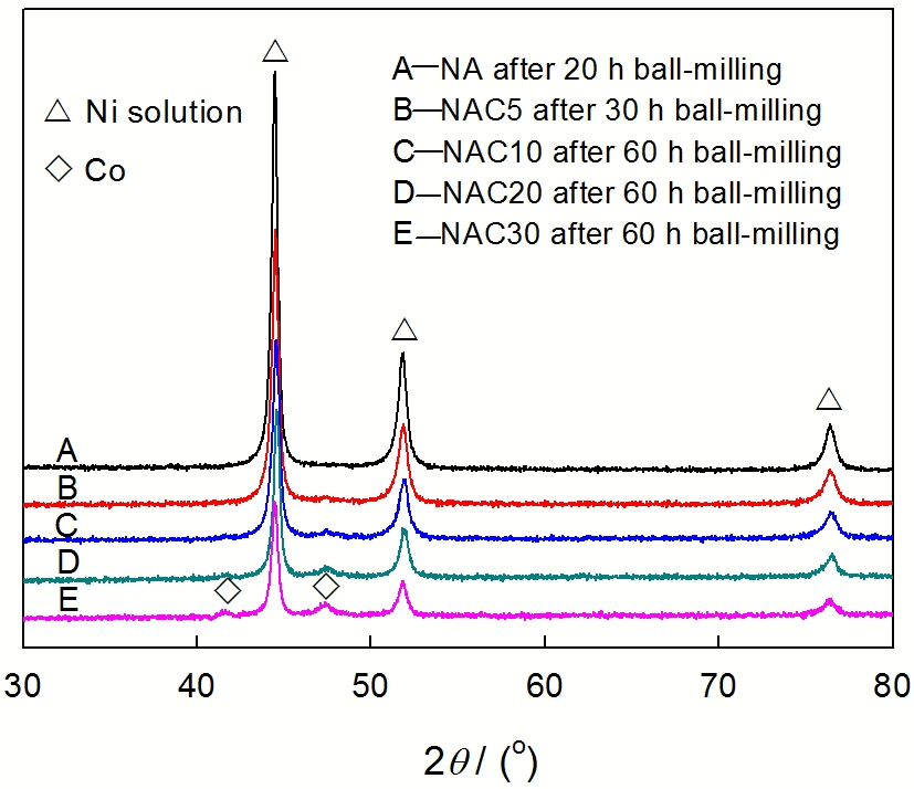 图1给出了不同Co含量的混合粉末球磨后材料的XRD图谱。从图1可见, 随Co含量的提高粉末机械合金化所需球磨周期增加, 当Co含量达到10%时球磨周期达到60 h(30, 40, 50 h尚有Co的存在, 未充分的完成机械合金化), 完成机械合金化; 当Co含量达到30%球磨60 h后, 仍有部分Co未固溶于基体中。