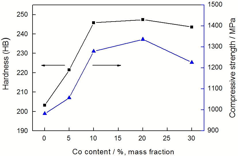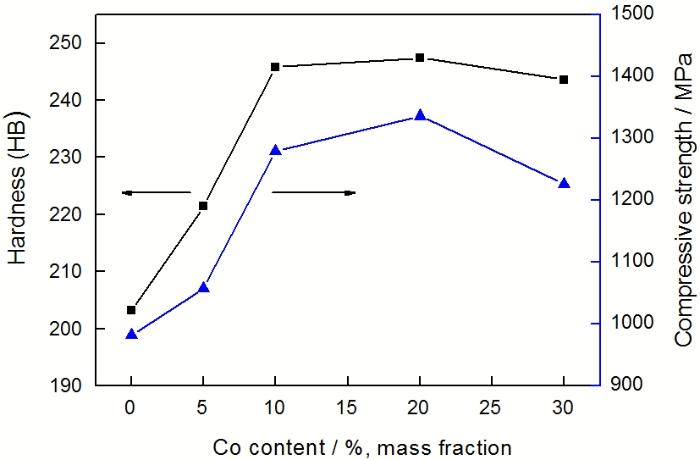 图4给出了合金硬度、抗压强度随Co含量的变化曲线。由图4可见, Co含量≤20%时, 随着Co含量的提高合金的硬度和抗压强度增加, 在Co含量为20%时硬度和抗压强度最大(合金的硬度为247.4 HB, 抗压强度为1336 MPa)。其原因可能在于, Co的固溶强化及Co可以抑制