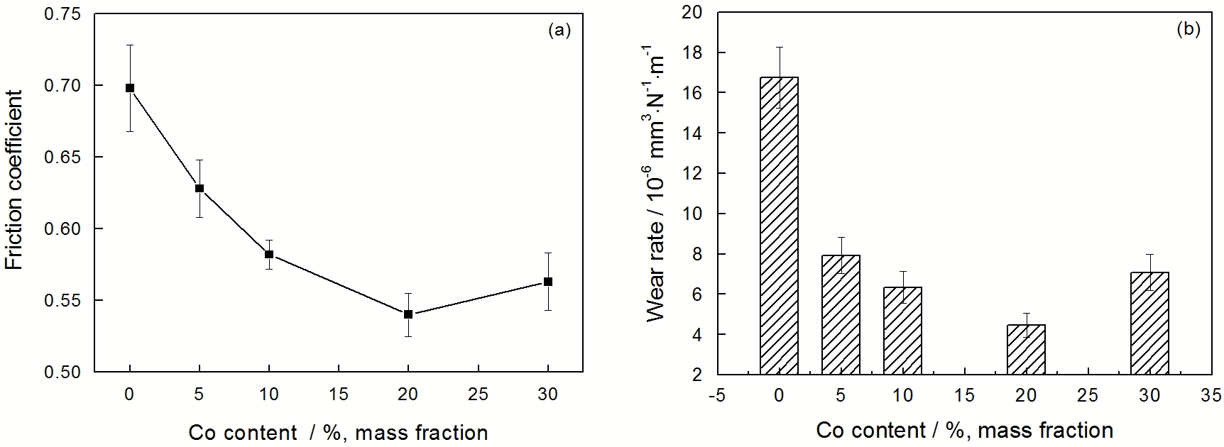从磨痕表面的SEM照片可以看到磨料磨损的迹象。磨损率与材料的硬度有直接的关系, 随着合金中Co含量的提高表层硬度提高(即变形抗力提高), 故磨损率降低。另外, 磨痕表面堆积的氧化物在硬质氧化铝球的反复碾压作用下最终釉质化, 这层氧化物“釉质层”的形成避免了陶瓷球与金属基体的直接接触 [8, 10], 起到明显的减摩抗磨作用, 使磨损率降低。但是当Co含量达到30%后氧化膜“釉质层”的脱落又加剧, 导致磨损率又有一定程度的提高。