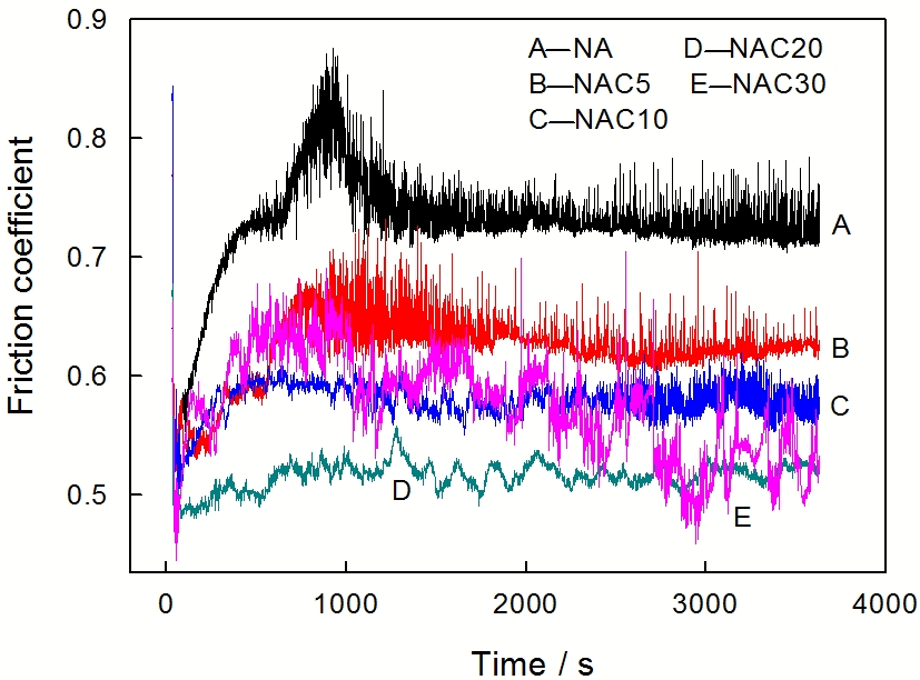图5给出了合金的摩擦系数、磨损率与Co含量的变化关系。由图5a可见, 当Co含量≤20%时合金的摩擦系数随Co含量的提高而降低; 当Co含量达到30%时, 摩擦系数又有升高趋势。由图5b可见, 当Co含量≤20%时合金的磨损率随Co含量增加而降低; 当Co含量达到30%时, 合金的磨损率又升高。图6给出了合金的摩擦系数与时间的关系。从图6可以看出, 随Co含量的提高合金摩擦系数降低; 对于NAC20合金, 摩擦系数降至最低, 且稳定; 但是含Co量较高的NAC30合金其摩擦系数又有所增大, 且波动较大。由此可见, 在800℃适量的Co可以改善Ni-Co-Al合金的摩擦学性能。当Co含量提高到30%时合金的摩擦性能变差。