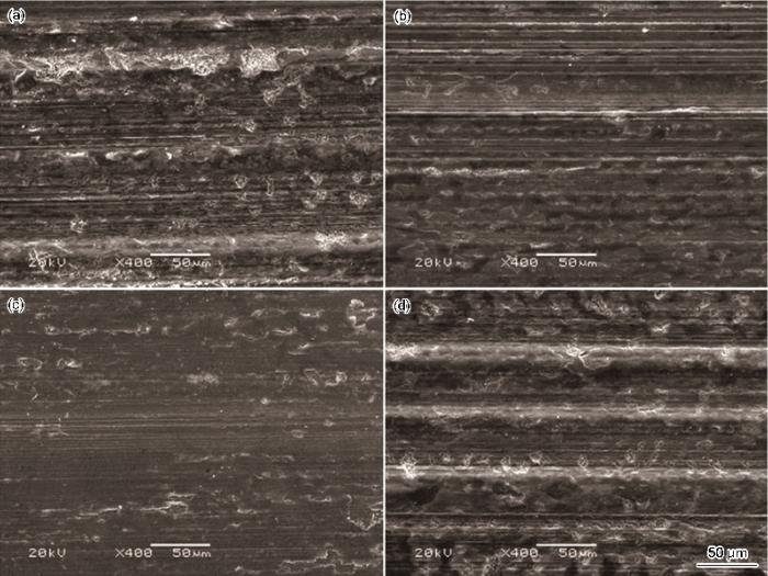 图7给出了合金摩擦后磨痕表面的SEM照片。从图7可见, 在高温摩擦过程中形成了一层“釉质层”。NA合金表面“釉质层”脱落严重, 并且存在较深的犁沟(图7a); NAC5合金表面“釉质层”脱落减轻, 但仍有较深的犁沟(图7b); NAC20合金表面不仅“釉质层”脱落减轻, 而且犁沟明显变浅(图7c); NAC30合金表面“釉质层”的脱落又加剧, 犁沟加深(图7d)。