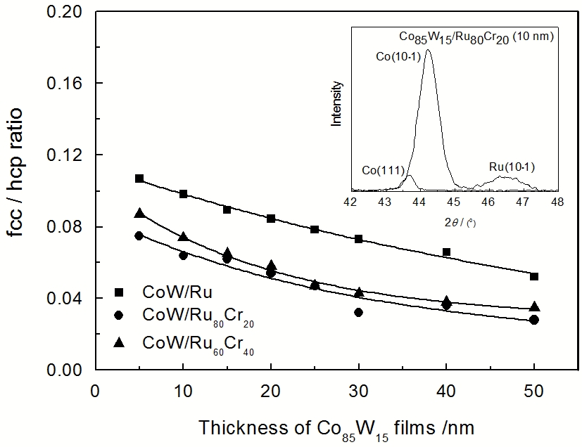 Fig.3 Volume ratio of fcc to hcp phases for Co85W15/Ru100-xCrx (x =0, 20, 40) films as functions of film thickness. The Inset is a contrast of fcc-Co(111) to hcp- Co(101) diffraction pattern of Co85W15/Ru80Cr20 thin film