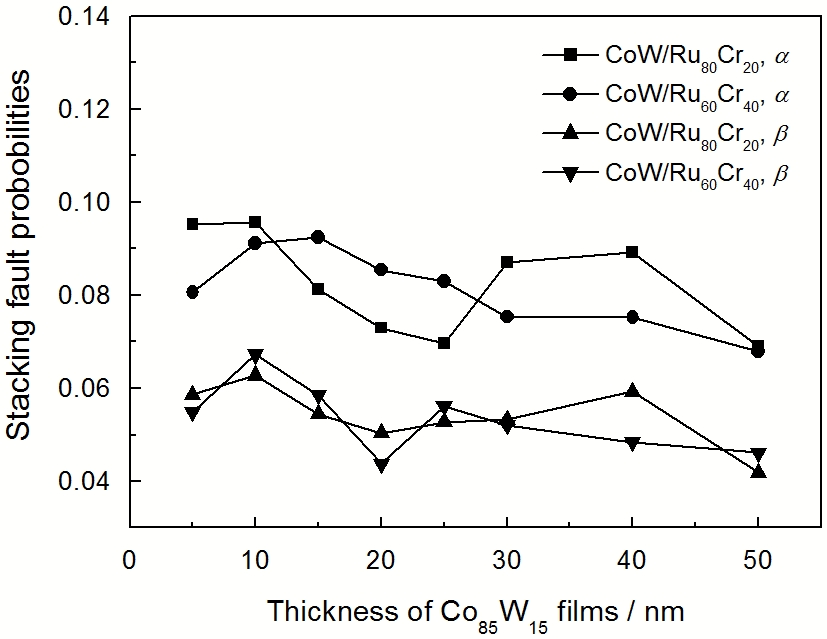 图4 Co85W15/ Ru100-xCrx (x=20, 40)薄膜堆垛层错与膜厚的关系