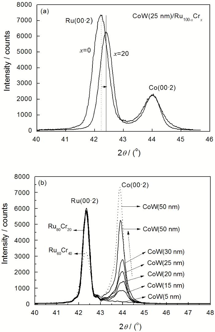 对于本文设计的新型Ru-Cr下底层, 在合适的成分范围内向Ru下底层添加Cr可调整Co-W磁性层和Ru-Cr下底层间的晶格错配度。添加的Cr固溶于Ru晶格形成Ru-Cr固溶体, 但是不改变Ru的hcp结构特征。hcp结构的Ru-Cr和Co-W薄膜有序地依次取向生长于MgO(111)单晶基板上, 取向关系为Co-W(001)[1