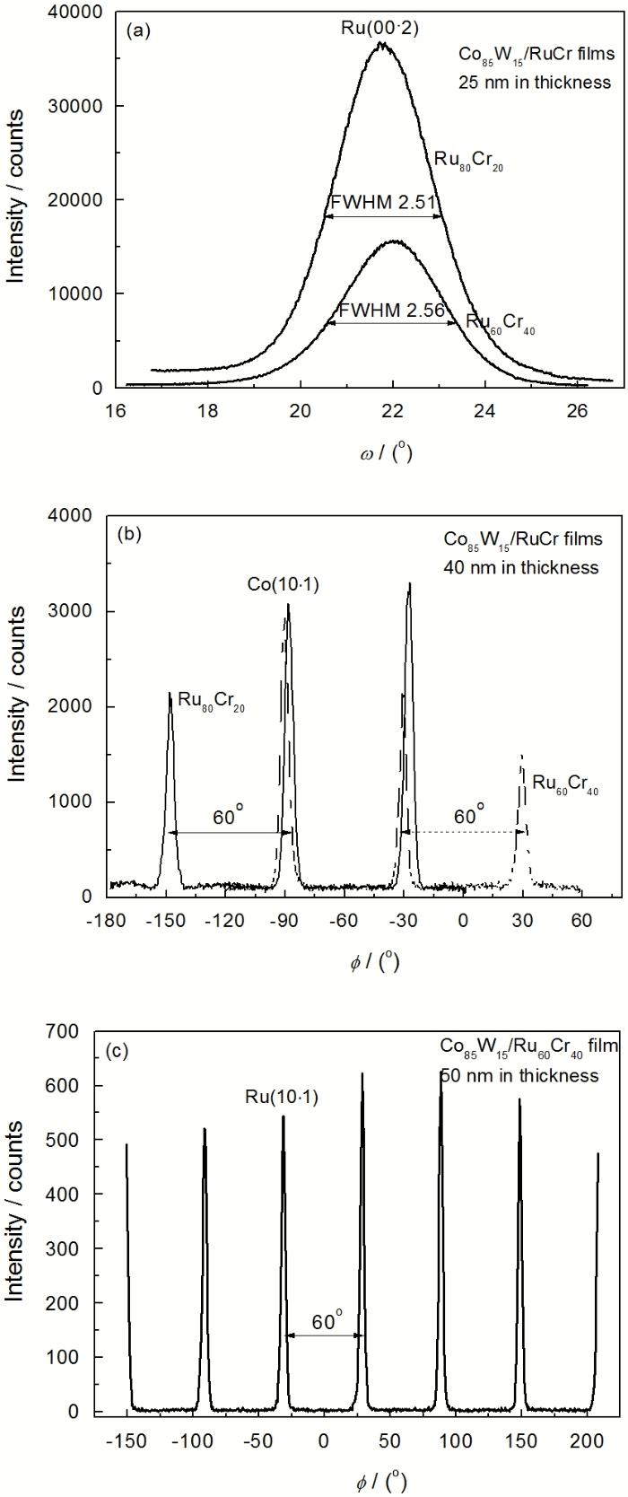 Fig.2 Rocking curves of Co85W15/Ru100-xCrx (x=20, 40) films (a), typical f scans for Co{101} and Ru {10·1} planes (c) of Co-W(002)/Ru(00·2)/MgO(111)