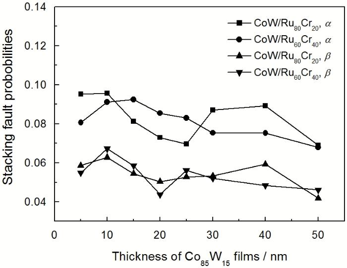 Fig.4 Relationship between the stacking fault probabilities and the film thickness for Co85W15/Ru100-xCrx (x=20, 40) films