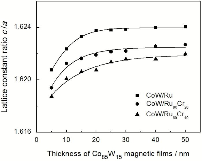 虽然Shimatsu等指出界面各向异性对磁晶各向异性的影响可以忽略[11], 但是磁各向异性常数Ku 的膜厚依存性机制仍尚未明确。尽管如此, 本文通过Ru下底层中添加Cr来减小晶格常数比c/a, 实现了Co-W薄膜的磁各向异性的提高, 并进一步证实了晶格常数比c/a对磁各向异性常数Ku的影响行为。由于晶格畸变可以较明显地影响到磁性层的磁各向异性, 通过设计下底层成分来调整磁性层和下底层间的晶格错配度, 进而控制和改善材料的磁各向异性也许是一种行之有效的方法。