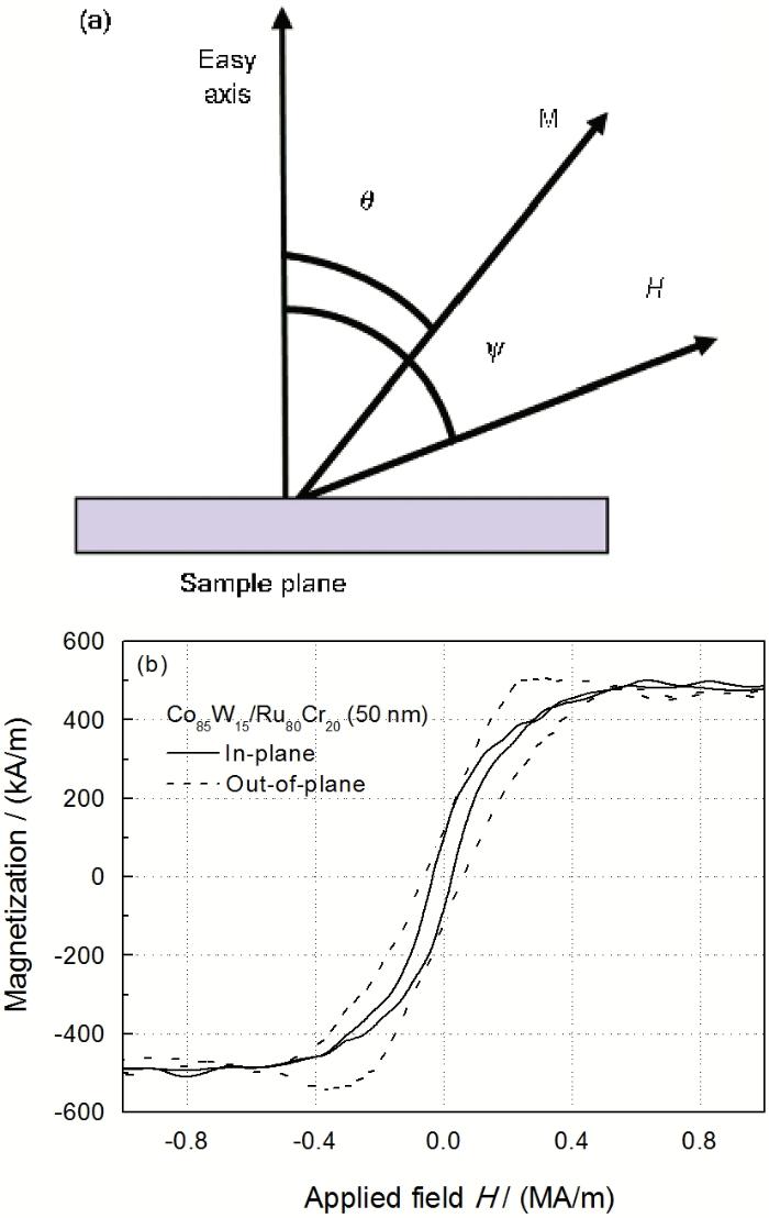 Fig.7 Magnetization of Co-W thin film with applied magnetic field (a) illustration of magnetization process; (b) typical magnetization curves for Co85W15/Ru80Cr20 (50 nm) films