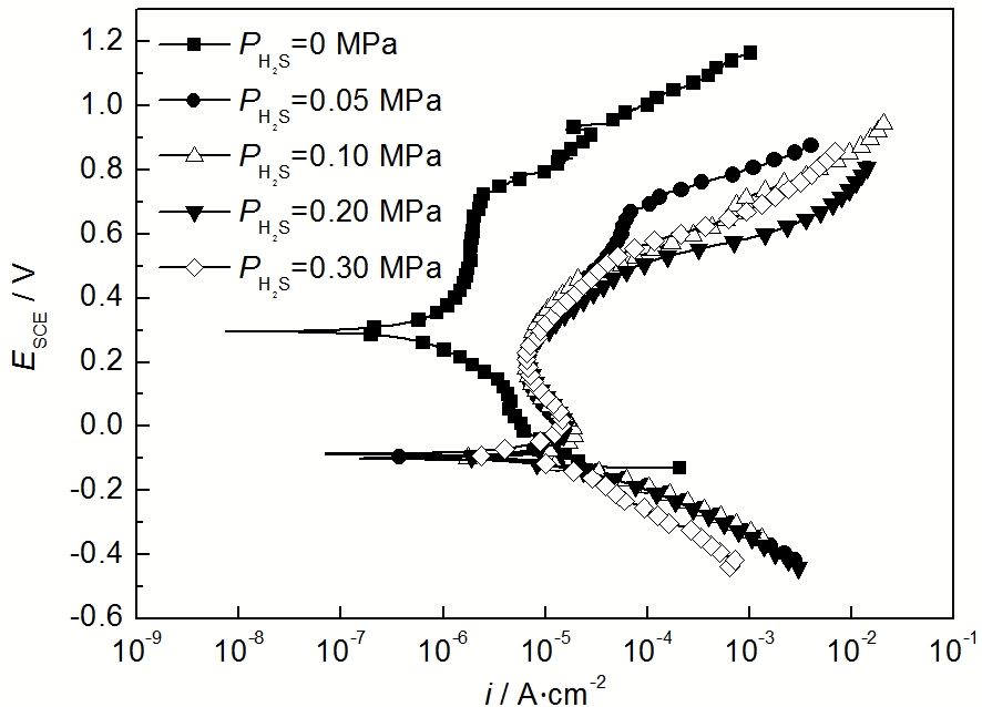 Fig.2 Polarization curves of 13Cr stainless steel under different H2S partial pressures