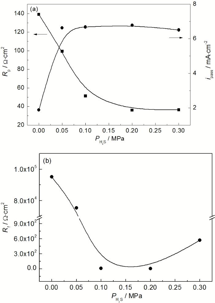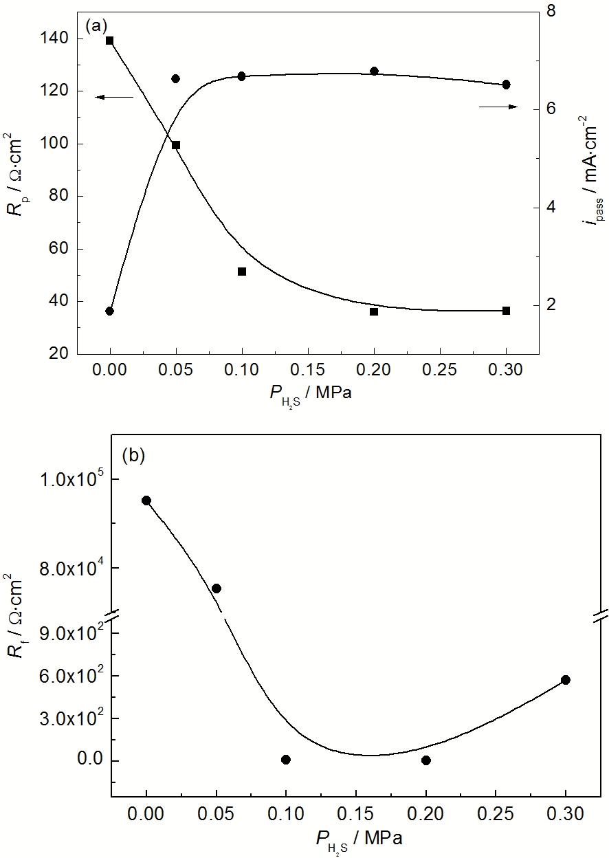 图4 极化电阻 (Rp)、维钝电流 (ipass) 及膜电阻 (Rf) 随H2S分压的变化曲线