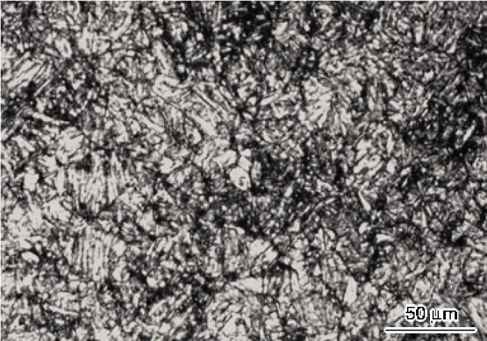 实验所用材料为13Cr不锈钢,其化学成分 (质量分数,%) 为:C 0.18,Si 0.03,Mn 0.48, S 0.004,P 0.02,Cr 12.94,Ni 0.1,Mo 0.013,Fe 余量。图1是13Cr不锈钢的金相组织,由图中可以看出,13Cr不锈钢为典型的马氏体组织。实验所用溶液为某油田CO2注气井环空水环境的模拟溶液,其成分组成为:NaCl 6.15 g/L,NaHCO3 2.71 g/L,Na2SO4 0.33 g/L,缓蚀剂1×10-,pH=4。使用分析纯的NaHCO3,NaCl和去离子水配置溶液,并用5% (质量分数) 的CH3COOH调节pH值为4。实验前,向溶液中通入N2 2 h,以消除环境中O2的影响。