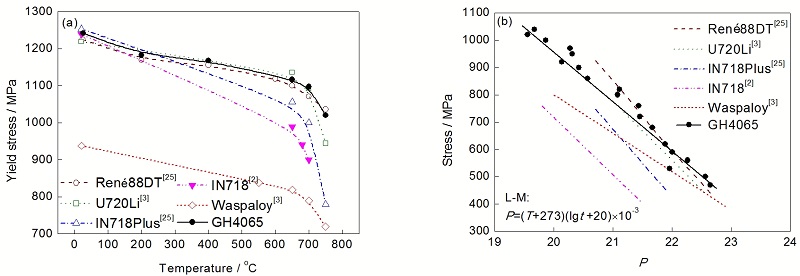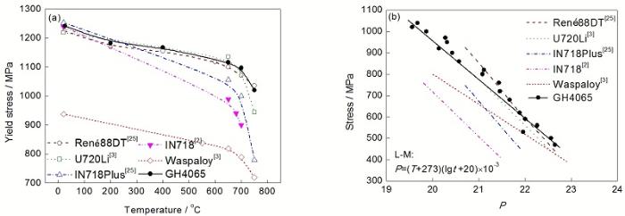 Fig.7 Tensile yield stress (a) and high temperature rupture properties (b) of GH4065 alloy in comparison with some typical disc alloys[2,3,25]
