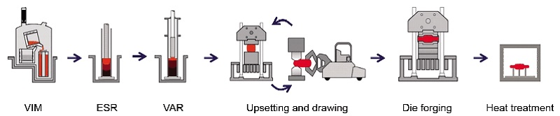Fig.1 Schematic of typical ingot metallurgy route of high performance wrought superalloy disc forgings (VIM—vacuum induction melting, ESR—electroslag remelting, VAR—vacuum arc remelting)