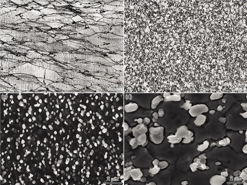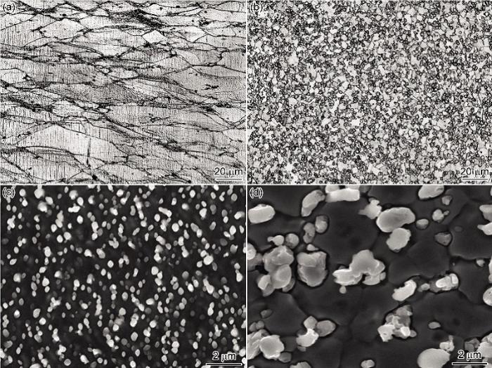 Fig.3 Low (a, b) and high (c, d) magnified as-deformed microstructures of GH4065 alloy during hot working process