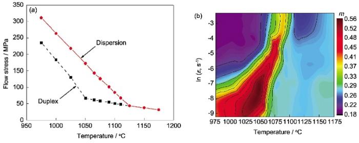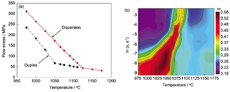 图4a为GH4065合金在相同变形条件下2种不同组织形态对应的流变应力. 由图可知, 相同变形条件下双相细晶组织的流变应力大幅度下降. 图4b给出了双相细晶组织流变应力的应变速率敏感系数m的变化情况. 可以看到, 双相细晶组织在两相区内形成了高m值区域, 这个区域指明了一个具备超塑性变形能力的塑性变形条件范围. 形成双相细晶组织后, 在低应变速率方向上, 变形温度允许降低至1000 ℃以下, 这一特征允许锻件在热模锻造条件下成型而不需要等温锻造条件, 从而可以大幅度降低成本. 更重要的是, 在接近γ’相全溶温度时, 材料可以在大于10-2 s-1的高应变速率范围内承受大变形, 这使得在普通快锻机上就可以实现合金的铸态组织破碎和细晶棒坯制备.