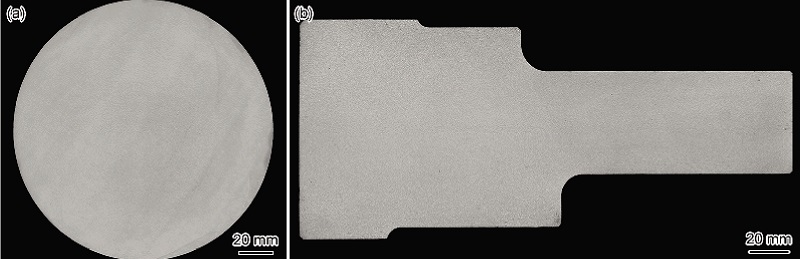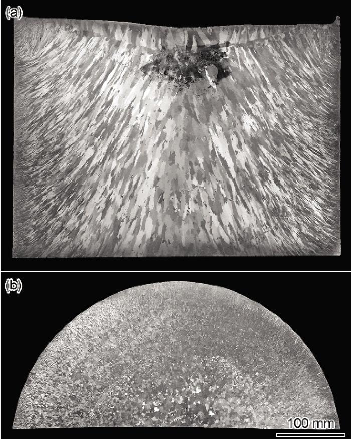 在对标准的三联熔铸工艺进行优化的基础上, 发展了高合金化的GH4065合金大尺寸锭坯的低偏析熔铸技术, 通过VIM与重熔(ESR+VAR)过程控制, 有效解决高合金化高温合金化学成分控制、气体与夹杂物的可靠去除等问题, 特别是在大尺寸钢锭的VAR过程中, 在熔速精确控制与He气冷却等技术的支撑下, 可以对凝固过程及凝固前沿的溶质传输行为进行调控, 特别是能够有效提高凝固前沿温度梯度、缩短局域凝固时间、减小熔池深度, 从而大幅度减小二次枝晶间距, 使得重熔锭的枝晶偏析被控制在许可的范围之内. 应用上述技术可以将GH4065合金直径508 mm自耗锭的二次枝晶间距降低至100 mm的水平, 同时各主元素的枝晶偏析系数分布在0.8~1.2的小范围之内. GH4065合金自耗锭的低倍组织形貌如图2所示. 由图可知, 大尺寸自耗锭的冶金质量得到了可靠的保证. 分析表明, 自耗锭沿轴向和径向没有出现宏观尺度的化学成分变化, 未观察到各种类型的冶金缺陷.