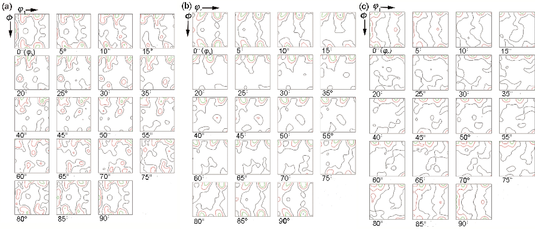 Fig.8 Orientation distribution function (ODF) maps of alloy 1 (a), alloy 2 (b), alloy 3 (c) under solution treatment condition (j1, j2 and f are the Euler angles)
