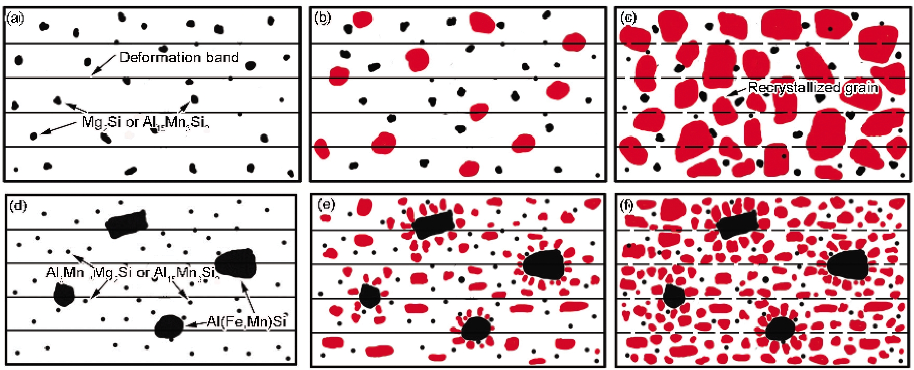 为了更好地说明3种合金随着溶质元素浓度增加, 或者不同尺寸粒子浓度增加, 合金在高温热处理过程中的再结晶晶粒形核和长大过程, 给出低浓度和高浓度合金对应的再结晶晶粒形核和长大模型图, 如图9所示. 对于低浓度1号合金, 基体内虽然也分布有一定数量的粒子, 但是粒子主要是Mg2Si和Al15Mn3Si2相. 这些粒子尺寸为纳米级或者亚微米级, 所以既不能在高温热处理过程中发挥PSN效应使得粒子周围大量再结晶晶粒形核, 也不能显著阻碍再结晶晶粒的长大, 最终使得随着热处理时间的增加, 合金内开始形成的再结晶晶粒快速发生长大( 图7a和图9a~c所示). 而对于高浓度3号合金, 由于合金基体内分布有大量不同尺寸粒子, 包括粗大的Al(Fe, Mn)Si相和细小的Mg2Si, Al6Mn或Al15Mn3Si2相等, 合金经冷轧变形后由于粗大粒子周围的应变储能较大, 在高温热处理过程中会诱发大量再结晶晶粒形核(图9e), 同时由于合金基体内还分布有较多的细小弥散粒子Al6Mn或Al15Mn3Si2相, 对于再结晶晶粒长大具有一定的阻碍作用, 最终使得合金再结晶晶粒尺寸细小均匀, 而且由于此阻碍作用也会使得晶粒取向旋转难度增加, 所以粒子浓度较高的3号合金同样出现了旋转立方织构, 但是旋转角度却仅为18°。