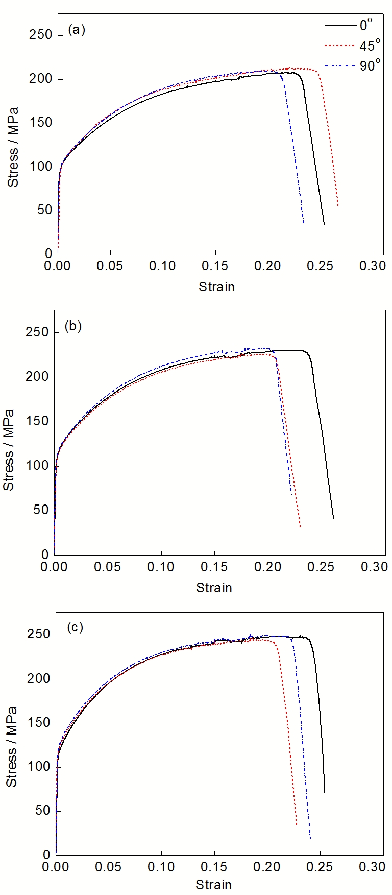 图2 3种合金沿不同方向的工程应力-应变曲线