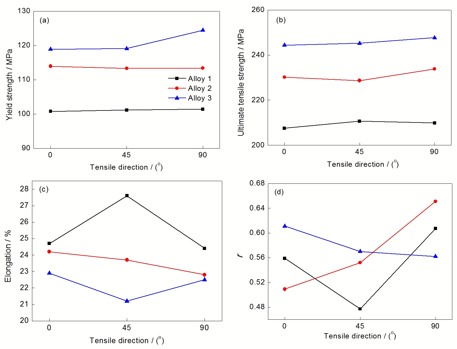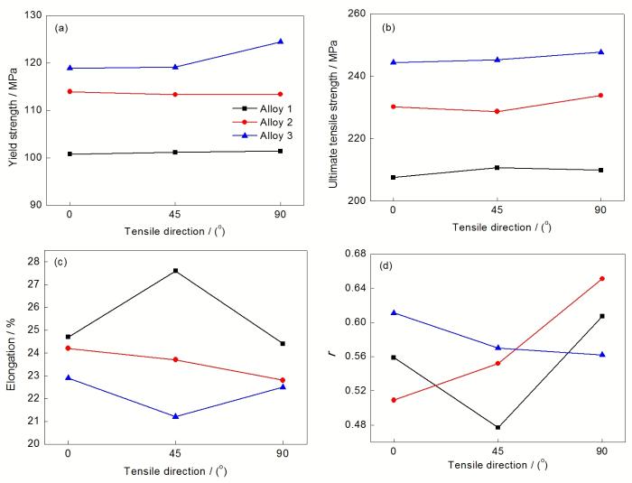 图2为3种合金经T4P处理后沿3个方向拉伸的工程应力-应变曲线. 根据应力-应变曲线, 绘制了合金沿0º, 45º以及90º 3个方向强度和延伸率变化的对比曲线图, 如图3a~c所示. 可以看出, 随着合金溶质元素浓度的增加, 合金屈服强度和抗拉强度均不断增加, 而且3个方向的强度基本一致. 但是随着合金成分和拉伸方向的变化, 合金沿不同方向的延伸率发生一定程度的变化. 由图3c还可以看出, 1号合金整体延伸率较高, 特别是沿45º方向的延伸率最高, 可达27.5%左右, 其它2种合金均随溶质元素浓度增加而略有降低, 而且与1号合金有所不同的是, 3号合金沿45º方向延伸率最低. 此外, 在拉伸过程中还对合金的塑性应变比r进行了测量(延伸率达15%时进行测量), r随合金成分和拉伸方向的变化如图3d所示. 可以看出, 合金成分和拉伸取向对r影响显著, 根据每种合金沿3个方向的r可以求得该合金的平均塑性应变比