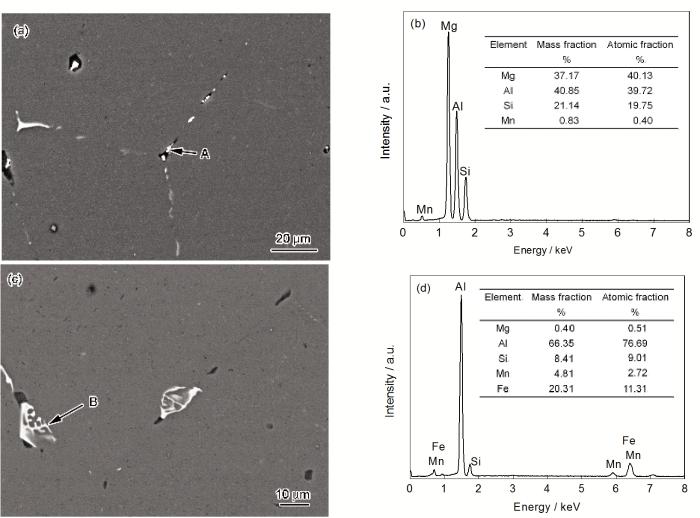 为了更好地理解成分与热加工过程对合金板材显微组织的影响规律, 有必要对其不同状态的显微组织进行系统深入研究. 成分变化必然导致合金铸态组织发生一定变化, 但是并不显著. 为了更好地说明在变形前几种合金基体内存在的粗大粒子差异情况, 选择合金经均匀化处理后的显微组织加以分析. 图4a~c为3种合金经485 ℃, 3 h+555 ℃, 16 h双级均匀化处理后的显微组织, 升降温速率30 ℃/h. 可以看出, 经均匀化处理后, 合金组织均匀性较好, 而且未发生低熔点相过烧现象. 不过随着合金成分的变化, 特别是Fe, Si和Mn元素的增加, 合金基体内均出现了一定数量的粗大粒子. 而且由于均匀化态样品均取自双级均匀化处理后再以30 ℃/h的降温速率降温到室温时的状态, 因此即使1号合金基体内也能观察到少量的粗大粒子. 由图5可以看出, 3种合金基体分布的这些粒子主要是Mg2Si, Al15Mn3Si2和α-Al(Fe, Mn)Si富铁相, 当然合金基体内必然还存在一定数量细小的亚微米或纳米级弥散粒子。