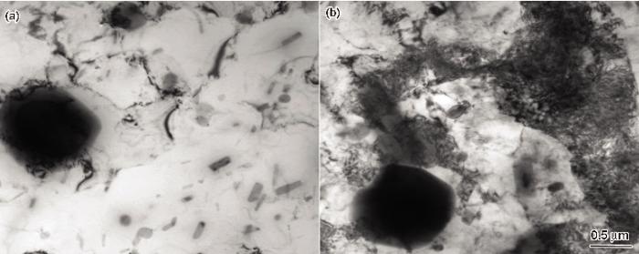 图6为综合性能较好的3号合金由4 mm冷轧到1 mm时的TEM像. 可以看出, 合金经热轧, 中间退火以及冷轧处理后, 合金基体内彻底形成了多尺寸粒子的分布状态, 包括微米级、亚微米级以及纳米级, 而且由于纳米级粒子对位错具有强烈的钉扎作用, 含有纳米粒子的晶粒内分布有大量缠结位错线(图6b). 这些粒子在后续固溶热处理过程会对合金再结晶晶粒的形核和长大等产生显著影响。