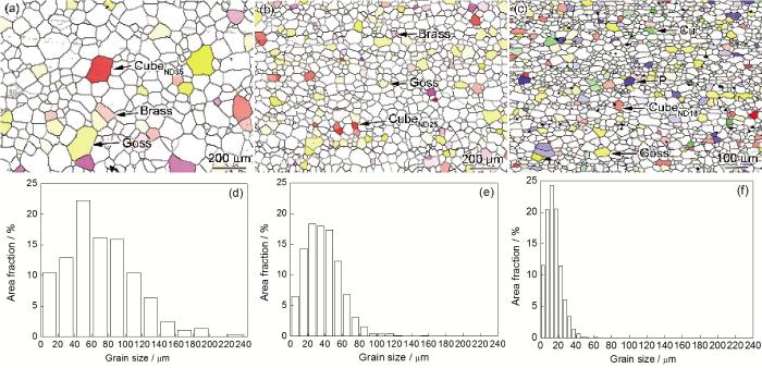 3种合金由于基体内含有不同尺寸的粒子最终使得合金力学性能和固溶态显微组织存在明显差异, 为了更好地分析再结晶晶粒大小、形态、取向以及分布状态, 有必要对其进行相应的EBSD分析. 由于80 ℃低温预时效对合金再结晶组织和织构影响非常小, 因此EBSD织构分析样品均取自直接固溶淬火后的样品. 图7为3种固溶淬火态合金晶粒大小及取向分布的EBSD分析. 可以明显看出, 合金随着溶质元素浓度的增加, 晶粒尺寸不仅明显减小, 而且大尺寸粒子周围一般分布有较多的细小再结晶晶粒, 3号合金最为明显. 这是由于合金基体内存在多尺寸粒子, 其中粗大粒子能够刺激再结晶形核, 而细小粒子能够显著阻碍再结晶晶粒的长大, 因此使得合金基体内再结晶晶粒尺寸随着溶质元素浓度的增加而降低. 此外, 粗大再结晶晶粒在冷轧变形带内形核并长大, 由于部分区域粗大粒子密度较小使得形核率较低, 所以此种类型的再结晶晶粒长大略显严重. 此外, 根据合金组织可以看出晶粒取向存在一定的差异, 图中红色代表旋转立方织构CubeND, 黄色为Goss织构, 粉色为Brass织构, 绿色为Cu织构, 蓝色为P织构。