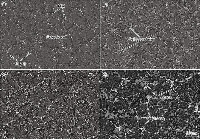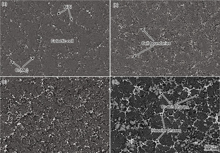 合金之所以发生这样的组织变化, 跟合金中Heusler相形成元素的总量有着直接的联系. 随着Zr的增加, 总的Heusler相形成元素由1.3%增加至2.3%, 且Zr具有更大的原子半径, 在NiAl和Cr(Mo)相中固溶度极低, 这意味着新增的Heusler相形成元素将主要位于晶界和相界. 表1所给出的合金中各相的成分也显示Hf和Zr在 Cr(Mo)相中含量极低, 在NiAl相所固溶的量也较少, 这意味着在合金的凝固过程中, Hf和Zr将会被排挤到固液界面前沿, 进而增加固液界面前沿的过冷度, 加快NiAl和Cr(Mo)相的生长, 从而细化NiAl/Cr(Mo)共晶层片. 由于Hf和Zr在NiAl和Cr(Mo)相中的固溶度差异, 导致凝固过程中NiAl的生长速度略快, 使得在凝固后期的共晶胞界的组织相对共晶胞内粗化很多, 且这种现象随着Heusler相形成元素的增加越趋严重. 当Heusler相形成元素的总量达到2.3%时, 其形成Heusler相消耗较多的Ni, Al, 使得合金的成分偏离共晶点, 进而导致粗大富Cr相在合金中出现. 由于成分的偏离较小, 且富Cr相的析出消耗了过多的Cr元素, 所以NiAl/Cr(Mo)共晶仍然是合金的主要特征, 但是NiAl/Cr(Mo)共晶层片却相对其它合金略微粗大. 而合金成分的进一步分析发现, 随着Zr含量的增加, 合金中Heusler相中的Zr元素不断增加, Cr(Mo)相中的Ni, Al元素不断减少, NiAl相中的Mo含量也不断减少.