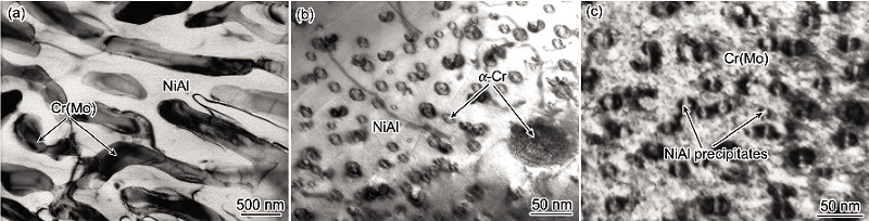 (2) Zr的添加导致粗大 b-NiAl和 a-Cr颗粒在Cr(Mo)和NiAl相中的析出, 且Heusler相形成元素在析出相界面的偏聚导致了大量界面位错的形成, 1%Zr的添加导致了Heusler颗粒在胞界NiAl相中的析出.