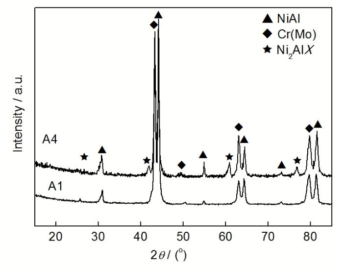 采用高纯Ni, Al, Cr, Mo, Ti, Hf和Zr (质量分数99.9%以上)作为原材料, 在Ar气保护下, 利用非自耗W电极在水冷Cu坩埚中熔炼不同Ti, Hf, Zr总含量的合金锭. 合金名义成分为Ni-33Al-28Cr-5.5Mo-1.0Ti-0.3Hf-xZr (原子分数, %), 其中, x=0, 0.3, 0.5, 1, 以下简称为A1, A2, A3, A4合金. 每个合金锭反复熔炼5次以上, 以保证成分的均与性. 由于合金锭在冶炼过程中的质量损失小于0.5%, 所以认为合金成分与名义成分一致.