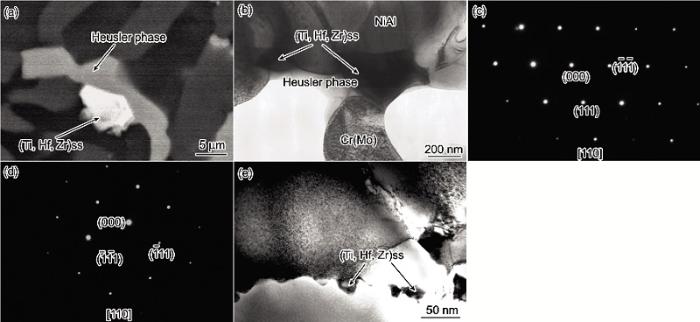 对A2合金共晶胞界的析出相的进一步观察发现, 这些析出相分为2种, 亮些的相呈多边形, 暗些的相呈不规则形状, 如图3a所示. 通过EDS分析发现, 相对亮些的相含有50%以上的Heusler相形成元素, 暗些的相则含有60%以上的Ni和Al. TEM观察进一步验证了共晶胞界的2种析出相Heusler相和(Ti, Hf, Zr)固溶体相(简称为(Ti, Hf, Zr)ss), 如图3b~d所示. 其中Heusler相为Ni2AlX, 其具有立方晶界结构, 晶格常数为0.6810 nm, 属于Fm3m空间群; (Ti, Hf, Zr)ss为立方晶体结构, 晶格常数为0.4400 nm, 属于