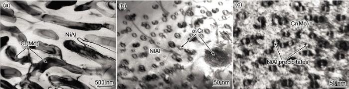 对A1合金的TEM像观察发现, 合金共晶胞中心区的NiA/Cr(Mo)层片组织仍然非常的细小, 且可以看到相界上存在着一定的界面位错, 但在相界处没有发现析出相, 如图4a所示. 对共晶胞区NiAl相的观察发现, 其内部析出大量的细小豆瓣状 a-Cr颗粒, 尺寸在20 nm左右, 如图4b所示. 根据前期研究[23,24], 这种析出状态的颗粒与NiAl基体存在着共格关系, 其主要归因于NiAl和Cr(Mo)共同的立方晶体结构和相近的晶格常数. 除了细小的共格 a-Cr颗粒, NiAl相中还存在少量尺寸大且满布位错的富Cr析出相, 其同NiAl基体存在半共格关系, 这种相的形成或许是由NiAl相中Ti, Hf, Zr元素在其相界面富集所致[25]. 对共晶胞内的Cr(Mo)相的观察发现, 其中析出了大量的 b-NiAl颗粒, 尺寸在20 nm左右, 同Cr(Mo)相存在共格关系, 如图4c所示.