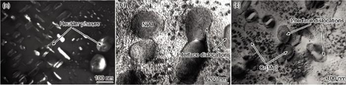 对A4合金的TEM像观察发现, 大量Zr的添加所带来整体Heusler相形成元素的增多, 进而导致Heusler相以不同的形态在NiAl相中析出, 如图5a所示. 在共晶胞界位置, 相对粗大的NiAl相中析出了方条状和球状为主的Heusler相, 尺寸在10~120 nm之间. 根据Li等[26]的研究, 大量Ti, Hf元素的存在会促进细小Heusler颗粒在NiAl相内的析出. 虽然本研究中Zr最大添加量为1%, 但Zr在NiAl和Cr(Mo)相中的固溶度都很低, 且Sheng等[27,28]的研究发现, 多种大原子元素的同时添加会相互促进其形成相在共晶胞界的析出. 因此, 可以看到A4合金中共晶胞界的Heusler相要显著多于0.5%Zr合金的, 除了多量的Zr所带来的Heusler相, 其所促使的Ti, Hf元素在共晶胞界的偏析也是原因之一. 因此, 后凝固的共晶胞界区域富集了大量的Ti, Hf, Zr元素, 其一方面提高了固液界面的过冷度, 促进了晶体的生长, 所以添加1%Zr的合金其共晶胞界仍然保持了更为完整的NiAl/Cr(Mo)层片组织, 不似添加0.5%Zr合金共晶胞界组织那么混乱. 另一方面, 大量Ti, Hf, Zr元素的富集导致了共晶胞界区域中NiAl相中Heusler相形成元素的过饱和, 所以在凝固后, 大量Heusler相从粗大NiAl相中析出. 对合金共晶胞内的NiAl和Cr(Mo)相观察发现, 其中的析出颗粒相对0.3%Zr合金有着显著区别, 如图5b和c所示. 在Cr(Mo)相出现了2种 b-NiAl颗粒, 一种尺寸较小, 为50 nm左右; 一种尺寸较大, 为300 nm左右. 无论哪一种析出颗粒, 其中都布满了界面位错. 在NiAl相内, 除了弥散析出的共格 a-Cr颗粒, 还有许多粗大半共格 a-Cr颗粒, 布满界面位错. 基于前面的分析, 这种半共格析出相的存在, 应部分归因于Ti, Hf, Zr元素在该区域的过饱和存在, 由此在NiAl和Cr(Mo)相造成了许多形核质点, 导致了部分 b-NiAl和 a-Cr析出相的析出和快速长大, 同时也会造成Ti, Hf, Zr析出相和基体界面的富集, 从而造成了大量界面位错的形成, 甚至布满整个析出相.