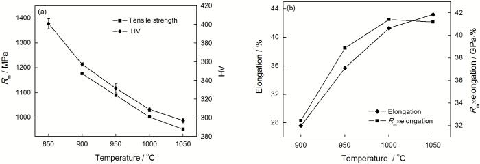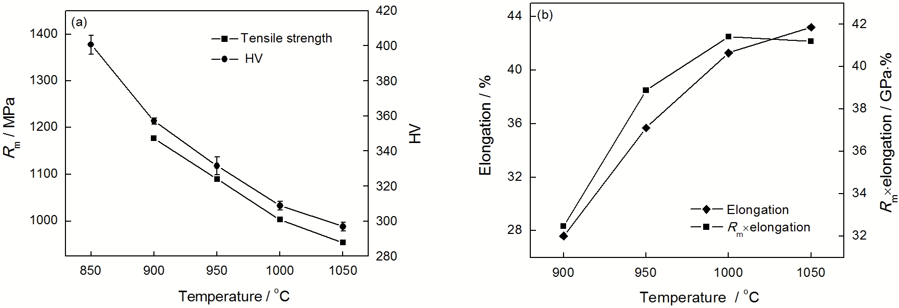 Fig.1 Mechanical properties evolution of experimental steel with annealing temperature, (a) tensile strength and hardness, (b) elongation and Rm × elongation