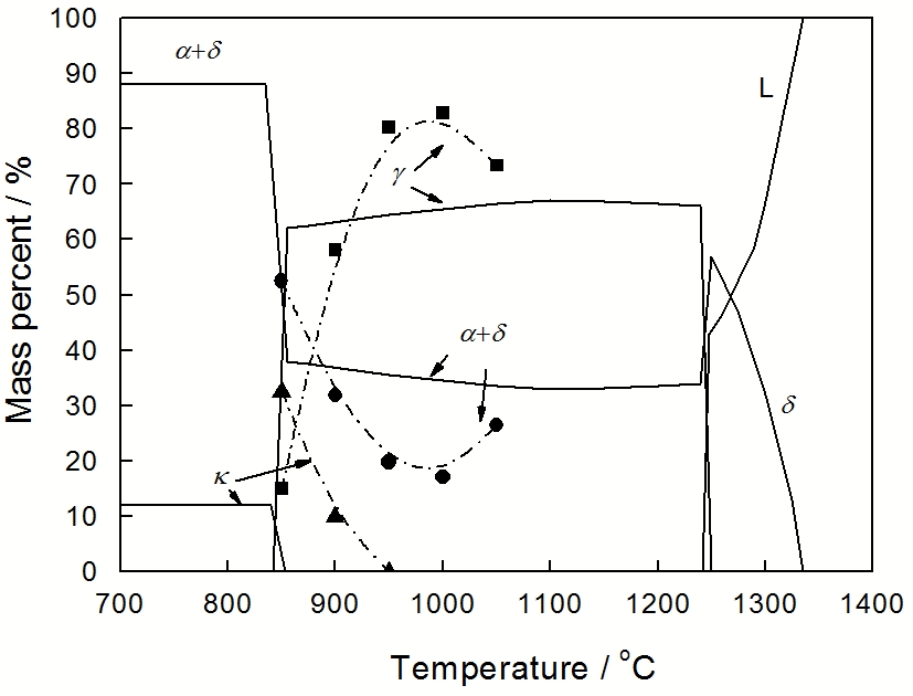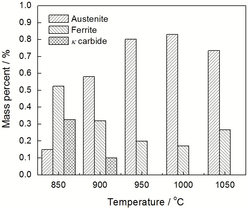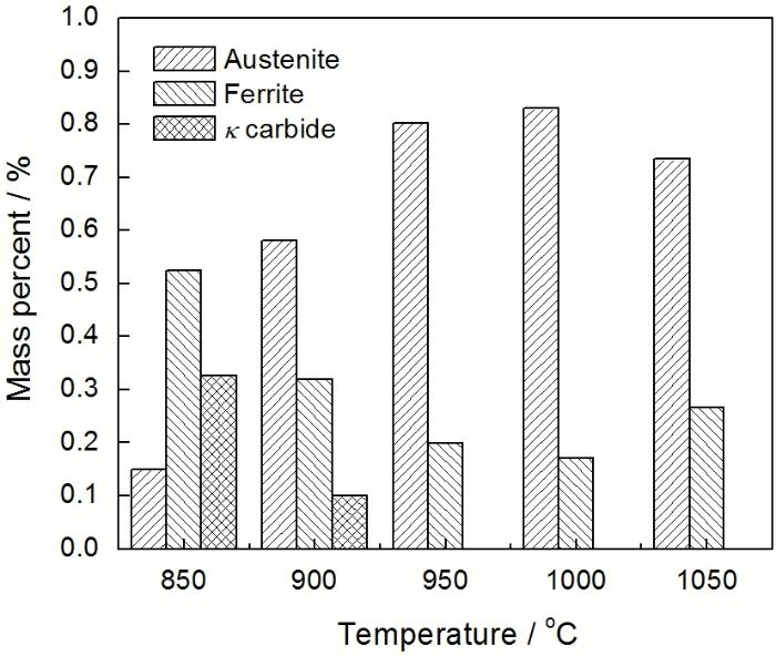 式中, Wi为计算相的质量分数, Ii为计算相XRD累积峰值高度, Ij、Ik为其它两相XRD累积峰值强度, K为各相所对应PDF卡的RIR比值; 在950-1050℃k碳化物累积峰值强度为0。根据公式计算出的各相的质量分数, 如图5所示。退火温度为850℃时铁素体所占体积分数达到最高值52.5%, k碳化物质量分数为32.5%, 而未转变奥氏体仅为15.0%; 退火温度为900℃时, 退火处理后主要为奥氏体基体+铁素体+k碳化物, 奥氏体质量分数为58.2%, k碳化物质量分数下降到10%; 随着退火温度的进一步提高, 碳化物完全固溶于基体当中, a-铁素体体积分数随温度的升高而下降, 在1000℃时铁素体质量分数达到最低值17.1%; 当退火温度达到1050℃时, d-铁素体不发生组织转变, 但是晶粒长大程度超过奥氏体, 质量分数增大到26.6%, 使XRD峰值升高。