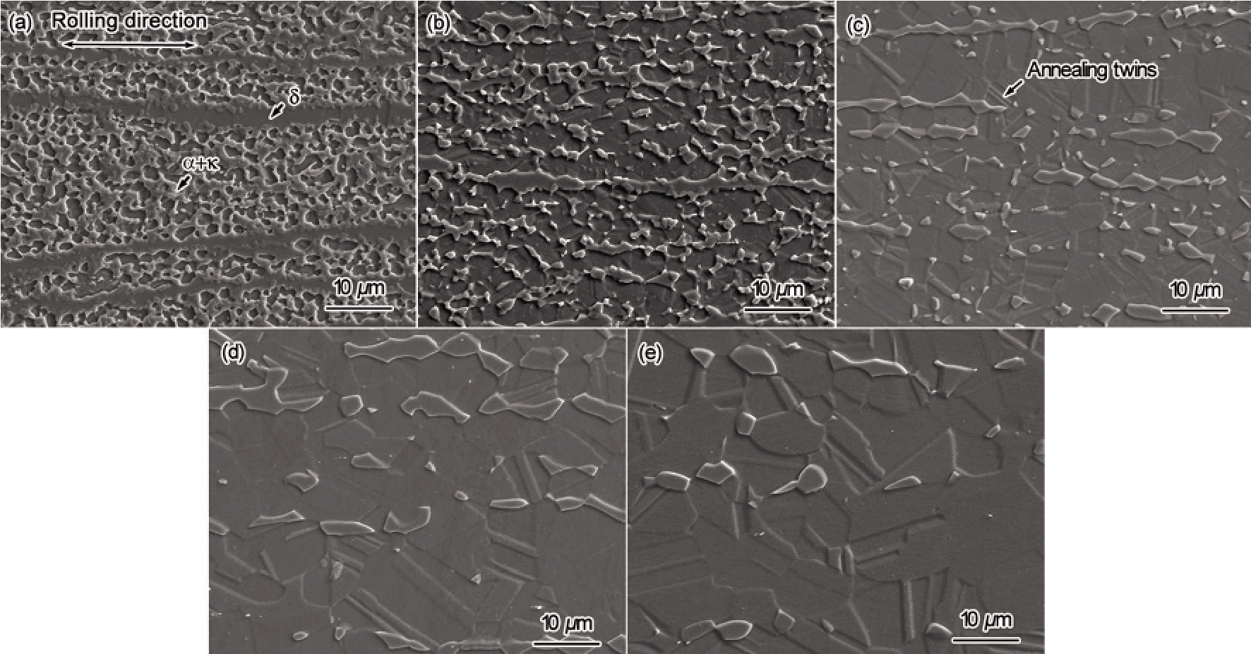 退火温度对Fe-Mn-Al-C钢的相组成影响显著。图3a给出了850℃退火后钢的SEM像, 可见部分铁素体退火处理后形貌上保持带状组织特征, 沿轧制方向分布, 为高温d-铁素体, 而a-铁素体在奥氏体晶界析出, 呈网状结构; 当温度为900℃时, 带状d-铁素体开始破碎分解, 而a-铁素体含量下降, 奥氏体晶粒内出现明显的孪晶结构(图3b); 温度为950℃时碳化物完全溶解, 可观察到明显的晶界迁移与晶粒长大(图3c); 温度为1000-1050℃, a-铁素体不断减少, 而d-铁素体已逐渐破碎成岛状, 不连续的分布于奥氏体基体中, 且d-铁素体与奥氏体晶粒随温度的升高而逐渐长大, 退火孪晶贯穿奥氏体晶粒。