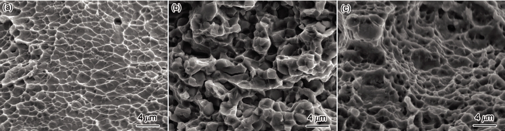图6给出了不同状态下钢板的拉伸断口形貌。冷轧钢板未退火前断口为韧窝形貌(图6a), 但韧窝较浅, 韧窝大小约为2 μm; 冷轧钢板虽然具有较高的强度, 但是其塑性较差。在850℃退火后为明显的脆性解理断裂, 为结晶状断裂特征。其原因是在该温度发生了