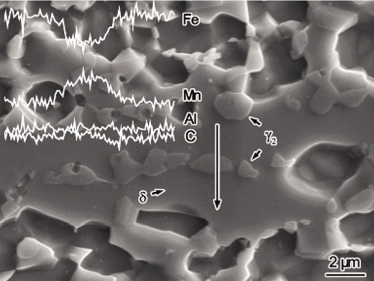 在退火过程中, 再结晶奥氏体形核主要发生在原始奥氏体与d-铁素体界面[17]。但是SEM观察发现, 在850℃退火转变过程中形成大量颗粒状组织, 大小为1-2 μm, 且沿轧向分布于d-铁素体内部或d/g界面, 其线扫描结果如图8所示。可以看出, 粒物组织中的Mn元素明显高于d-铁素体, 而Fe含量较低。Mn元素偏析常出现在高锰钢中, 奥氏体与铁素体分别对应于其富锰区和贫锰区[18], 二者的Mn元素含量存在一定差异, 颗粒组织中的Mn元素明显偏高, 根据Cr-Ni双相不锈钢的高温时效行为推断d-铁素体中形成二次奥氏体(g2)[19-21]。二次奥氏体主要形成在时效处理过程中, 通过控制奥氏体体积分数可改善其力学性能。