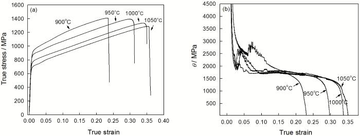 图2给出了在900-1050℃退火后试样拉伸真实应力-应变曲线和加工硬化曲线。可以看出, 实验用钢表现为连续屈服, 没有明显的屈服平台; 真应力随着真实应变的增大而增大, 近似于线性关系, 且峰值应力随退火温度的升高而下降。对真实应力-应变曲线求导得到钢板的加工硬化曲线(q=dσ/de), 如图2b所示。在900℃退火后试样变形初期加工硬化较高, 且随应变的增大而迅速下降, 导致其断后伸长率较低[7]; 在950-1050℃退火处理后实验用钢表现为明显的连续加工硬化行为。当应变小于0.10时加工硬化率存在一定的波动范围; 当应变大于0.10时加工硬化率趋于稳定, 发生连续的加工硬化; 在变形后期加工硬化率逐渐下降, 当加工硬化率为0时对应于峰值应力。实验用钢的连续加工硬化使其拉伸真实应力随真实应变的增大而增大, 表现为高强度与高塑性的良好组合。