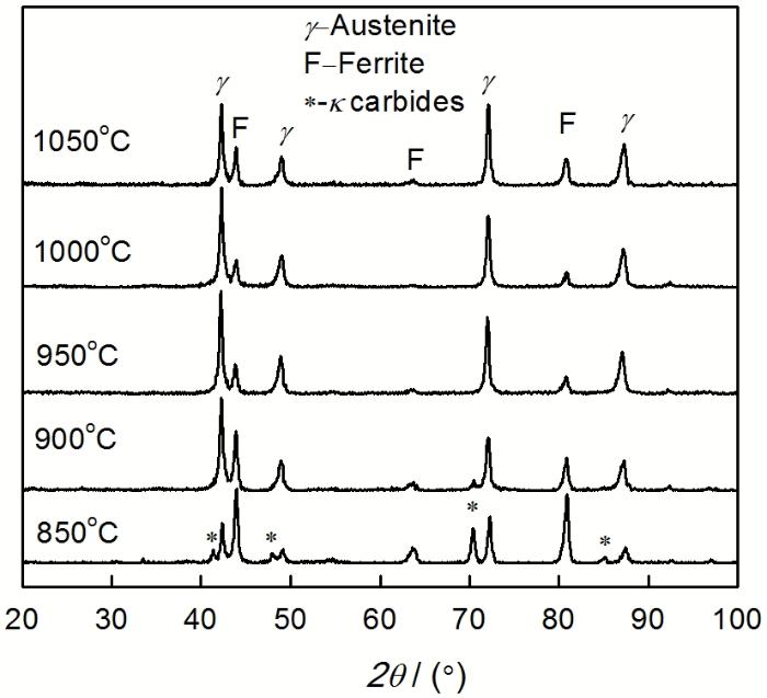 Fe-Mn-Al-C钢在850-1050℃退火处理后, 对试样进行XRD分析, 如图4所示。可以看出, 在850℃退火处理的试样主要为奥氏体+铁素体+k碳化物, 铁素体峰值为a-铁素体与d-铁素体峰值叠加; 两相组织对比, 可见铁素体峰值明显高于奥氏体, 因为在退火过程中发生了共析反应, 即