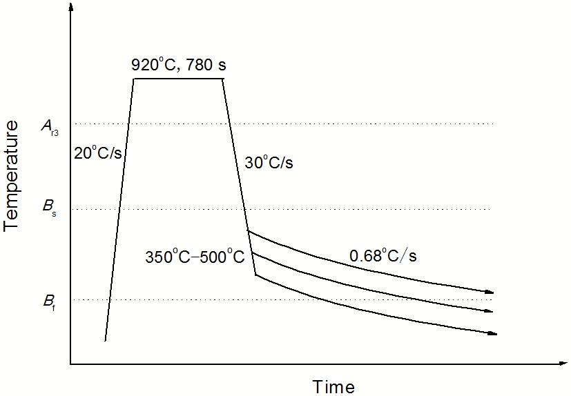 本文所研究的(B+M/A)复相组织通过卷取连续HOP技术获得。如图1所示, 实验钢在920℃奥氏体化后, 以30℃/s的冷却速度冷却到Bs~Bf间不同的卷取温度(380℃、410℃、440℃、470℃、500℃)终止, 使部分未发生相变的过冷奥氏体保留, 产生适量的贝氏体和奥氏体。随后以卷取冷却速率(0.68℃/s)进行缓慢冷却的连续配分处理。在低于卷取温度的缓慢冷却连续配分过程中, 贝氏体中的碳向奥氏体扩散, 使未转变的奥氏体富碳, 以提高奥氏体的稳定性。其中, 稳定性差的奥氏体在继续冷却中转变为M, 部分稳定性好的奥氏体保留至室温, 形成M/A组元。因而经卷取连续HOP处理后, 实验钢的最终组织为(B+M/A)复相组织[7, 8]。在这种卷取连续HOP工艺中, 卷曲温度是一个重要的工艺参数。首先, 卷曲温度起到终冷温度的作用, 决定着配分前贝氏体和奥氏体的比例。其次, 卷曲温度作为起始配分温度, 影响着卷曲连续冷却过程中最终的配分效果。在等温加热HOP工艺中, 终冷温度和配分温度均可独立控制。而在卷取连续HOP工艺中, 终冷温度和配分温度均由卷曲温度所控制。已有的研究结果表明[7-11], 卷取连续冷却的余热足以保证碳自贝氏体向奥氏体的扩散, 可满足在卷取过程中产生(B+M/A)复相组织的要求。图1是卷取连续HOP的工艺曲线和参数, 实验在Gleeble-3500热模拟实验机上进行。