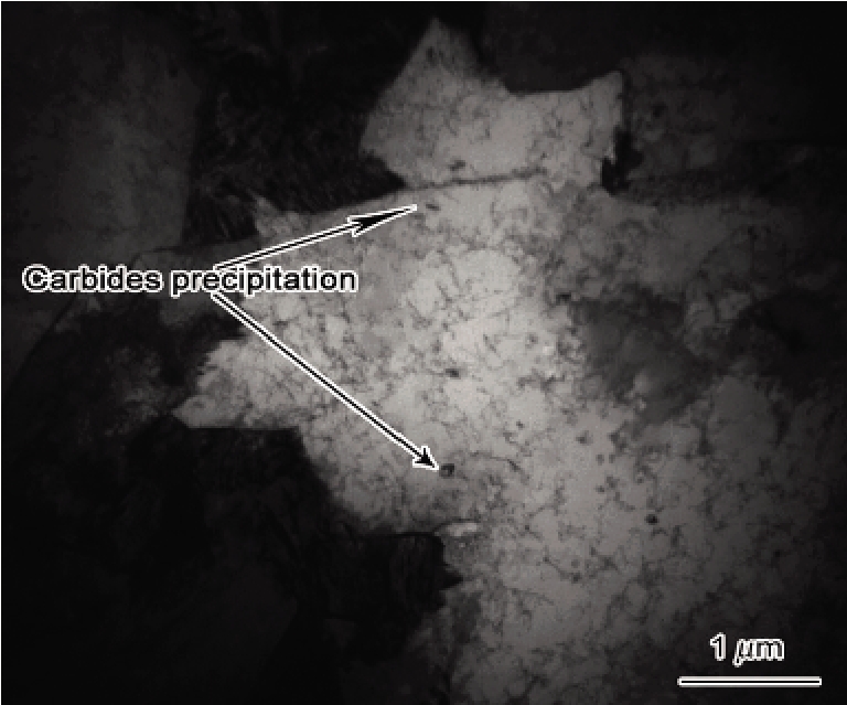在卷取连续HOP处理时, 碳原子的配分和碳化物的析出降低了贝氏体基体中的碳含量, 导致碳的固溶强化效果下降, 贝氏体晶格畸变减小, 同时相变应力也得到消除。作为基体的贝氏体被软化, 所以随着卷取温度的升高, 材料的屈服强度呈逐渐下降的趋势(图3), 而抗拉强度在较高卷取温度(470℃)时有上升的趋势。这是由于卷取温度较高时, 碳化物析出明显, 如图9所示。管线钢是一种Nb、V、Ti微合金化钢, 由于Nb、V、Ti为强碳化物形成元素, 在高温配分过程中可析出合金碳化物, 这种细小弥散分布的碳化物增强了对位错的钉扎, 产生沉淀强化作用, 使得强度有所升高[4, 7-9, 15-16]。继续提高卷取温度, 由于碳化物的粗化, 这种沉淀强化的作用减弱。