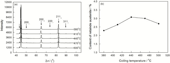 为进一步获得残余奥氏体的定量分析结果, 对实验钢中的残余奥氏体进行了XRD分析。图16a为不同卷曲温度下(B+M/A)X80管线钢的残余奥氏体典型衍射峰, 不同卷取温度下残余奥氏体含量变化曲线如图16b。结果表明, 随卷取温度升高, 残余奥氏体含量先增加后减少, 呈峰值分布, 与TEM的观察结果一致。