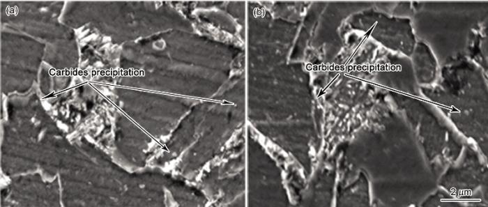 经不同卷取温度HOP后, X80管线钢组织的SEM像如图5所示。由图可见, 在不同卷取温度下, 实验钢均为(B+M/A)复相组织。其中深灰色的基体为贝氏体, 分布在贝氏体基体或之间的亮白色区域为M/A[12, 13]。由于终冷温度和配分温度均由卷取温度所控制, 经不同卷取温度处理后(B+M/A)两相比例不同, 即贝氏体和M/A的组织含量发生变化。在卷取温度较高时, 可以观察到基体中碳化物的析出, 高的放大倍数下, 碳化物较为明显, 其形态如图6所示。