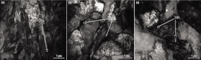 Fig.10 TEM images of M/A at typical coiling temperature, (a) 380℃, (b) 440℃, (c) 500℃