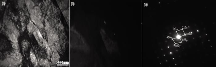 Fig.13 Bright-field and dark-field images (a, b) and electron diffraction pattern (c) of residual austenite at coiling temperature of 380℃